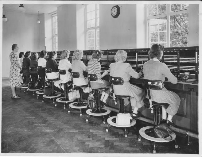 Operators R to L: Molly Mitson, Jean Woollard, Jean Smith, Iris Blades, Rae Spear, Thelma Bishop, Gillian Barnett